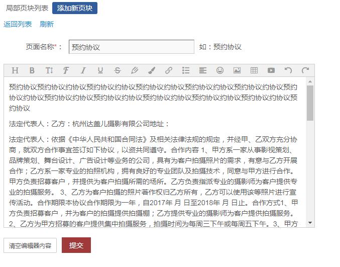 [新增]微頁面新增了局部頁塊,用于一些頁面的局部內(nèi)容,如首頁采用預(yù)約需知方式可添加預(yù)約協(xié)議。