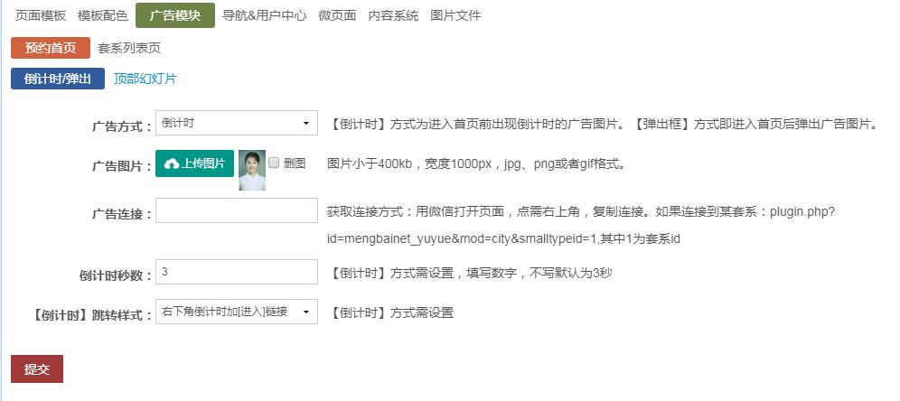 [新增]預(yù)約首頁新增自定義頁面及寫好的頁面導(dǎo)入功能,之后會(huì)多些頁面可以自定義,包括城市列表頁,分店列表頁及套系列表頁。 [新增]預(yù)約首頁新增彈出廣告或者倒計(jì)時(shí)廣告。
