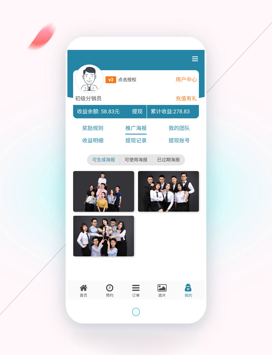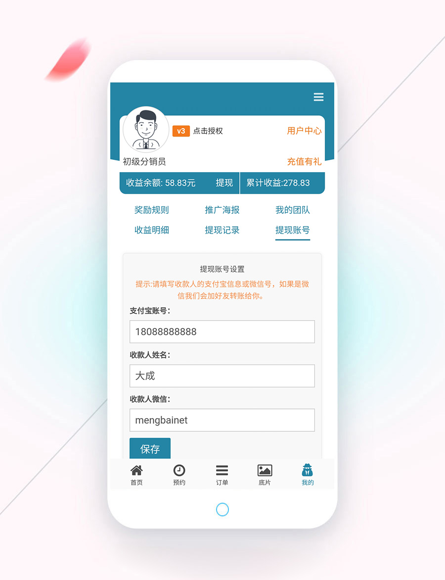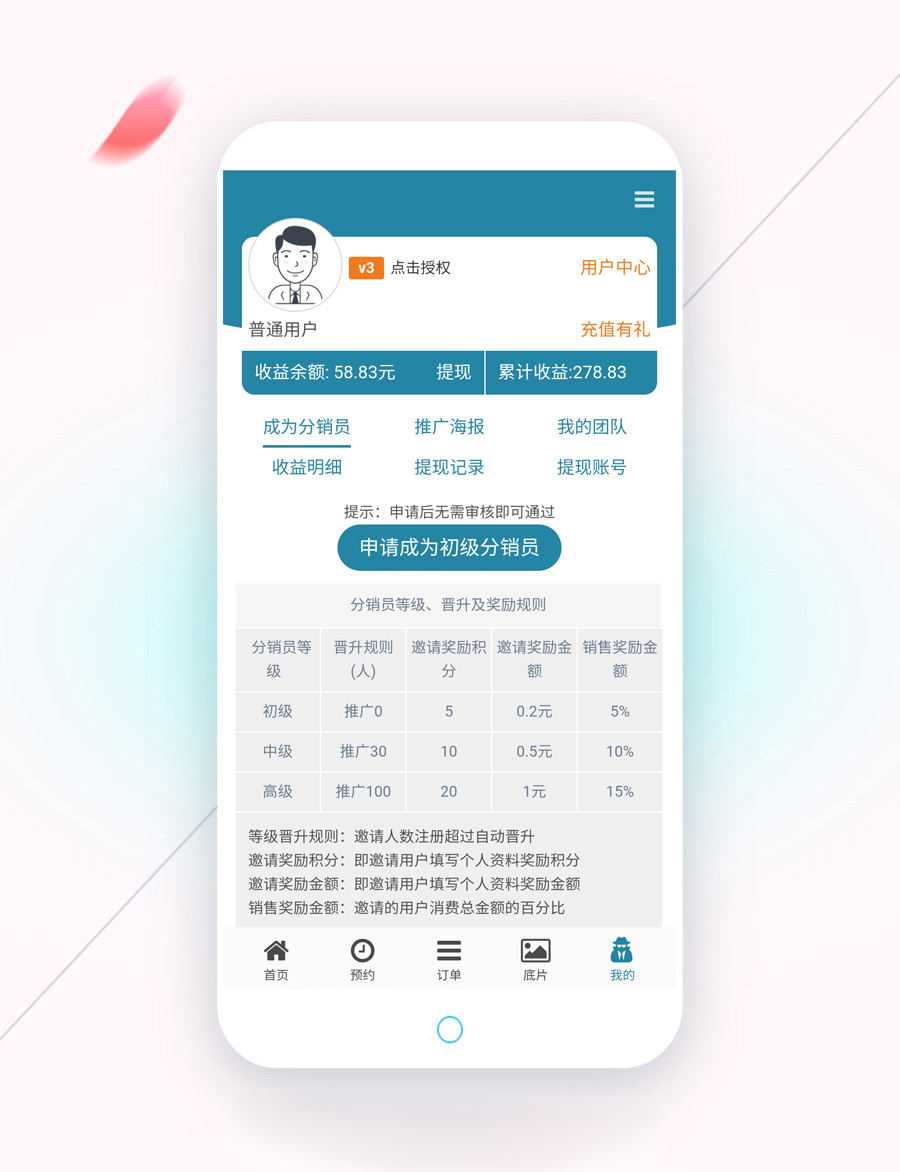 2、銷售獎(jiǎng)勵(lì):根據(jù)分銷等級(jí)設(shè)置不同百分比傭金。
