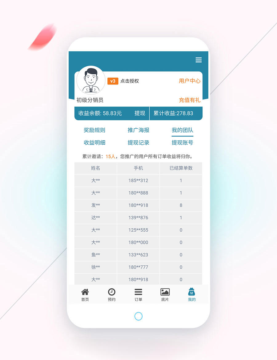 八. 我的團(tuán)隊(duì) 分銷員查看被推廣的部分信息。