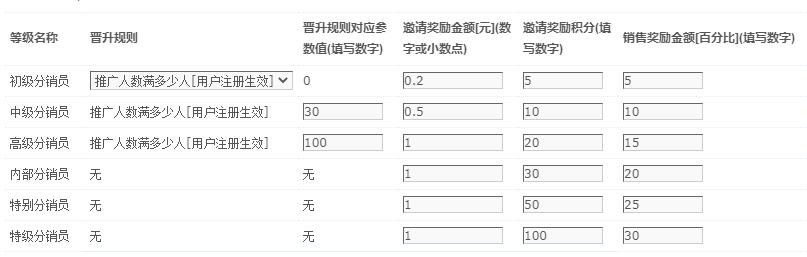 分銷商等級(jí)不同收益也不一樣,等級(jí)分為:初級(jí)分銷員、中級(jí)分銷員、高級(jí)分銷員、內(nèi)部分銷員、特別分銷員、特級(jí)分銷員、取消合作分銷員7種,其中初、中、高級(jí)分銷員可隨著推廣人數(shù)或推廣銷售訂單數(shù)自動(dòng)晉升。取消合作分銷員即取消推廣權(quán)限也不可再申請(qǐng),內(nèi)部分銷員、特別分銷員、特級(jí)分銷員可設(shè)置不同的收益。