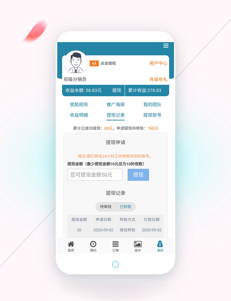 十. 提現(xiàn)申請(qǐng)、提現(xiàn)記錄、提現(xiàn)賬號(hào) 可設(shè)置最低提現(xiàn)金額及提現(xiàn)金額需為最低金額的倍數(shù),可設(shè)置可申請(qǐng)?zhí)岈F(xiàn)在日期,如周一、周二。分銷員申請(qǐng)?zhí)岈F(xiàn),商家有權(quán)限管理員可收到申請(qǐng)?zhí)岈F(xiàn)通知。