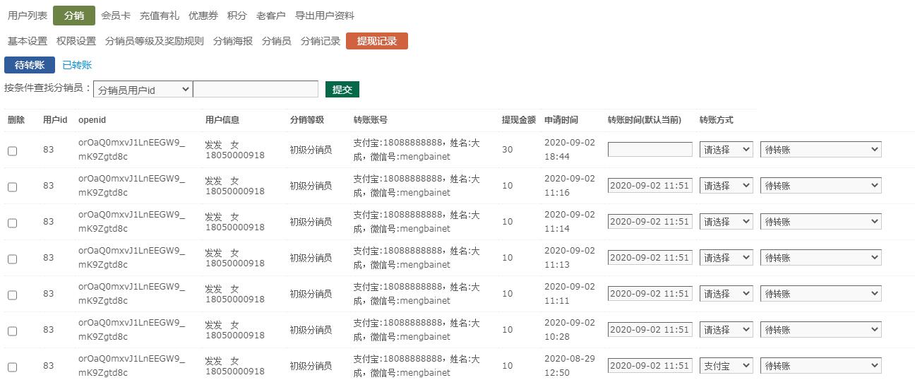 查看提現(xiàn)記錄,轉(zhuǎn)賬給分銷員時(shí)可對(duì)分銷員推送消息: