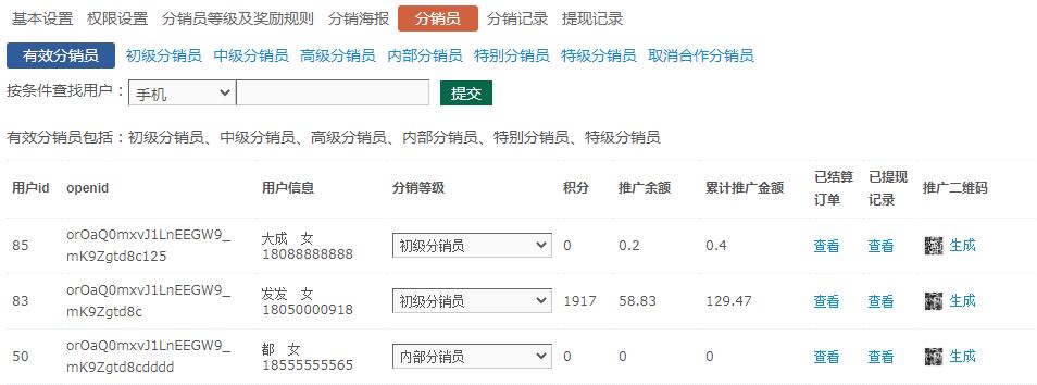 十一. 后臺(tái)功能截圖 查看每一個(gè)分銷員的信息: