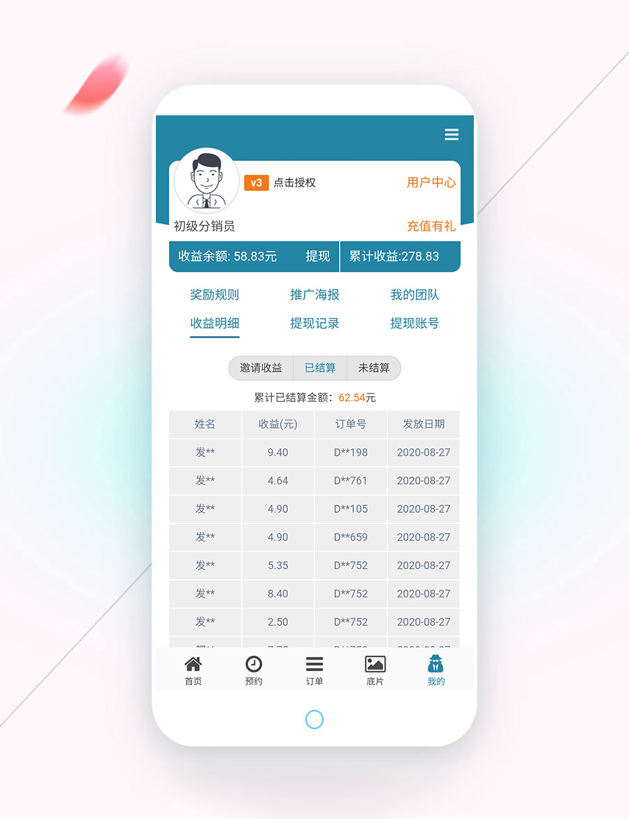 九. 收益明細(xì) 收益明細(xì)分為:邀請(qǐng)收益、銷售收益、未結(jié)算,未結(jié)算為已下單未拍攝的訂單。