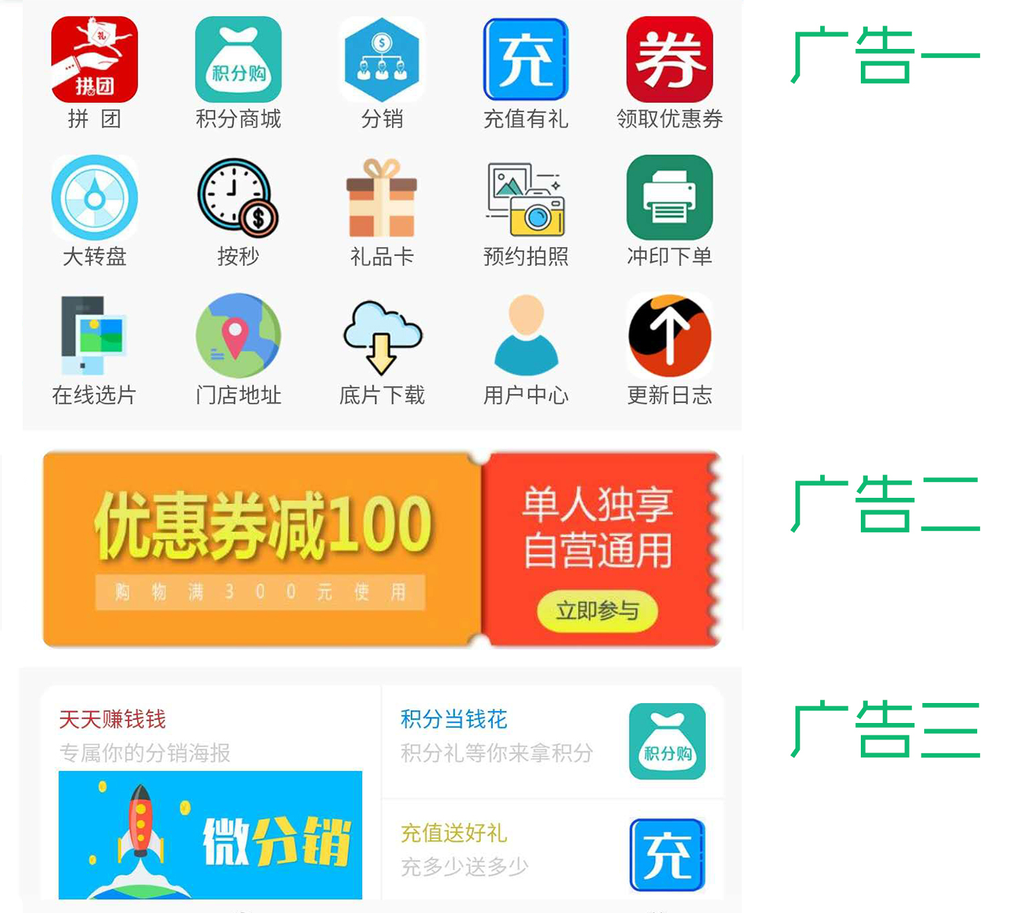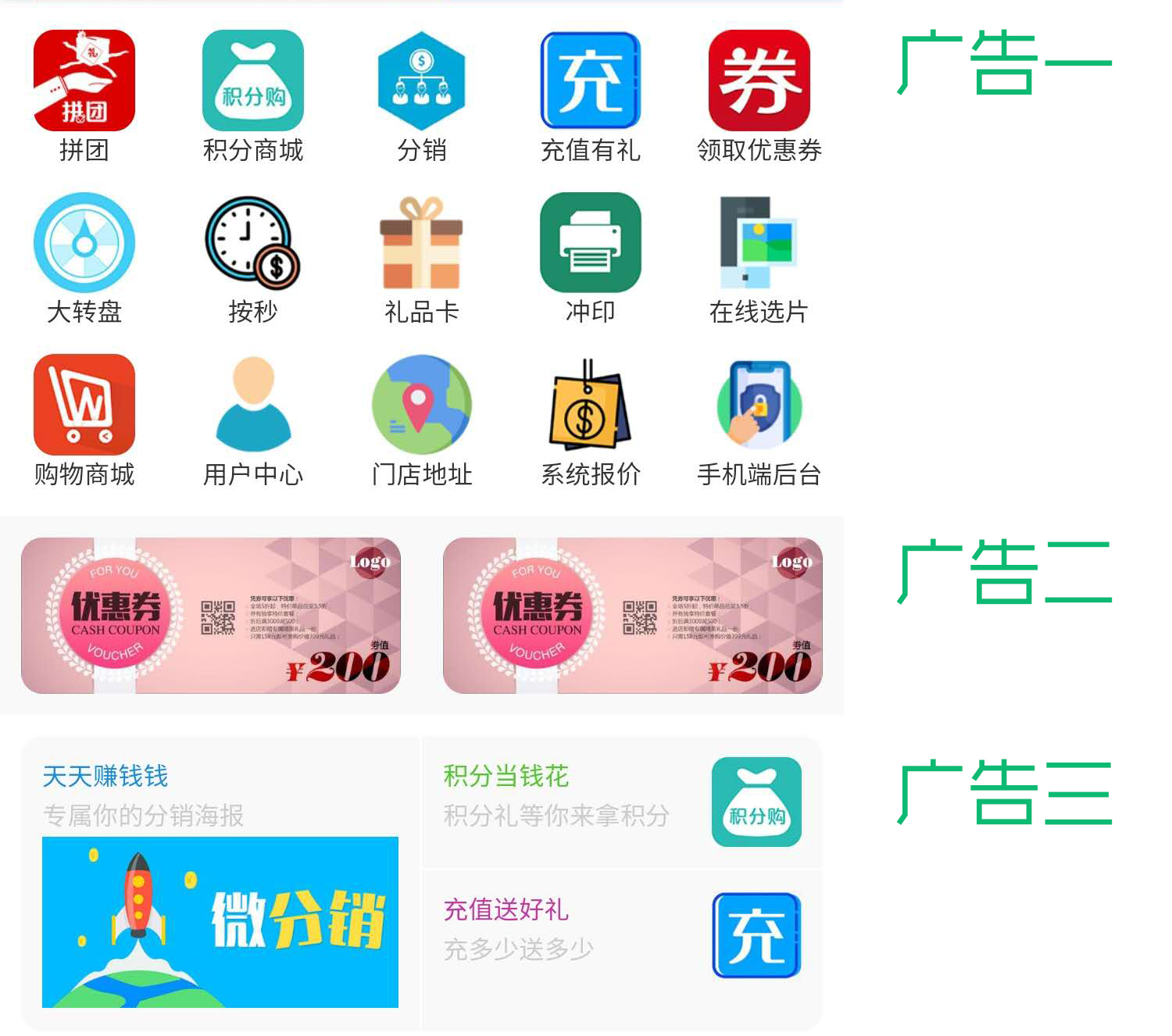 查看演示可掃以下二維碼關(guān)注公眾號 本次更新以下內(nèi)容: 廣告一:可自定義列數(shù)、圖標,內(nèi)置兩種圖標。 廣告一:可自定義列數(shù)、圖標,內(nèi)置兩種圖標。 用戶中心目前四種樣式,兩種內(nèi)置,兩種自定義。 咨詢預(yù)約類系統(tǒng)(可定制開發(fā)各行業(yè),如旅游帶團、健身房、教育課程、美業(yè)預(yù)約等)、選片系統(tǒng),可聯(lián)系: |
